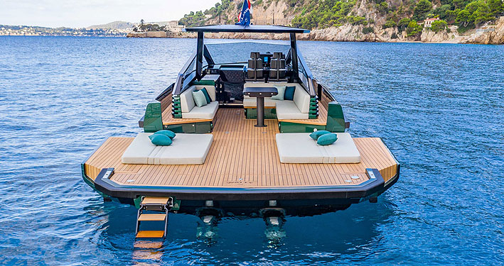 En esta nueva propuesta se aprecian dos detalles determinantes que acentúan su exclusividad y rabiosa actualidad, como son su cubierta walkaround y la capacidad de ampliar significativamente la superficie habitable de a bordo, gracias a las dos plataformas laterales de popa que se crean abatiendo las bandas de las amuras.