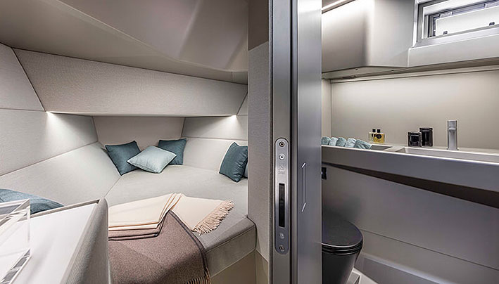 Adoptando las características líneas modernas y angulosas propias de la marca, esta nueva joya del astillero monegasco crea en la cubierta de proa un espacio para disfrutar del sol de estilo sundeck, dejando paso a una cabina de la que surge el puesto de gobierno y un ligero y dinámico T-top de estructura de carbono que cubre buena parte de la bañera. En esta zona integra dos largos asientos enfrentados con una mesa, mueble-bar y zona de navegación.