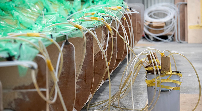 También se aplican más técnicas que mejoran la sostenibilidad de los trimaranes NEEL, como la laminación mediante infusión, que limita al máximo el uso de resinas y sus emisiones, además de reducir notablemente el peso de la embarcación al combinarlo con refuerzos especiales de fibra de carbono en los puntos de tensión más exigentes, para asegurar una gran solidez estructural manteniendo un peso ligero.