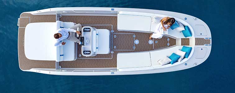 Además de unas líneas muy elegantes y llamativas, con su gran proa redondeada que amplía la capacidad de la cubierta, para este primer modelo Christian Grande ha diseñado un casco optimizado para el motor eléctrico Molabo Iscad intraborda de 50 kw o el Yamaha Harmo 3.7 kw con Pod. En ambos casos disfruta de un confortable ritmo de navegación y una buena autonomía.