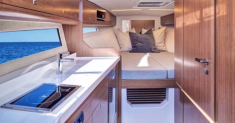 El astillero se ha decantado por mantener un aspecto y configuración práctica y espaciosa, que tan buenos resultados ha proporcionado en modelos anteriores de la gama, con una cubierta que se puede acolchar totalmente en proa para crear un amplio solárium, al que se accede por una sección central practicable del parabrisas y su propia escalera integrada.