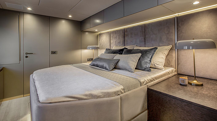 Los generosos volúmenes dentro de los cascos del 60 Sunreef Power se pueden personalizar fácilmente con distribuciones, equipamiento y acabados para adaptarse a cualquier programa de navegación y estilo de vida, pudiendo optar básicamente entre 7 y 8 camarotes dobles.