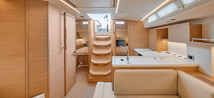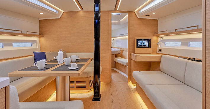 En cubierta la bañera es especialmente ancha y despejada en la abierta popa, con dos ruedas de gobierno en las bandas y largos bancos enfrentados, mientras que bajo cubierta, en un espacio especialmente luminoso, ofrece tres camarotes dobles y dos baños, además de un comedor acompañado de completa cocina y mesa de cartas.