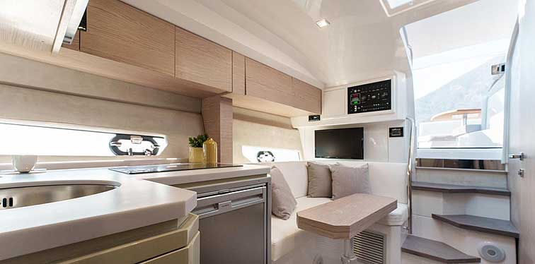 Bajo cubierta también ofrece dos tipos de distribución, con o sin cocina interior, además de contar invariablemente con dos camarotes dobles con buena visibilidad al exterior, un comedor y un baño independiente