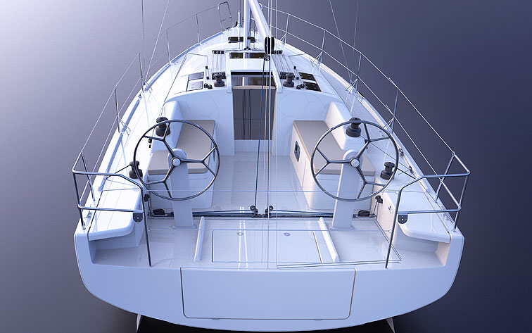 En su versión Racing propone una bañera amplia y moderna con dos ruedas de timón, ligeramente sobre elevadas, que permiten al patrón avanzarse hacia el winche de vela mayor cuando navega con tripulación reducida.