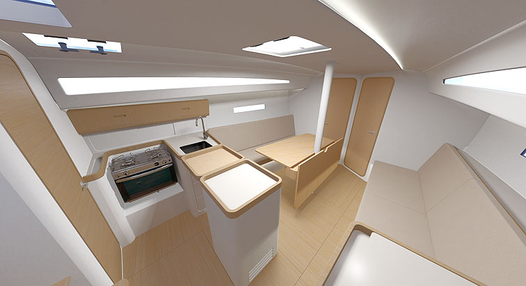 Aunque es rápido, el First 36 también pretende ser confortable y polivalente, disponiendo para ello de una cabina espaciosa con tres camarotes dobles, un aseo independiente y todos los elementos necesarios para la vida a bordo.