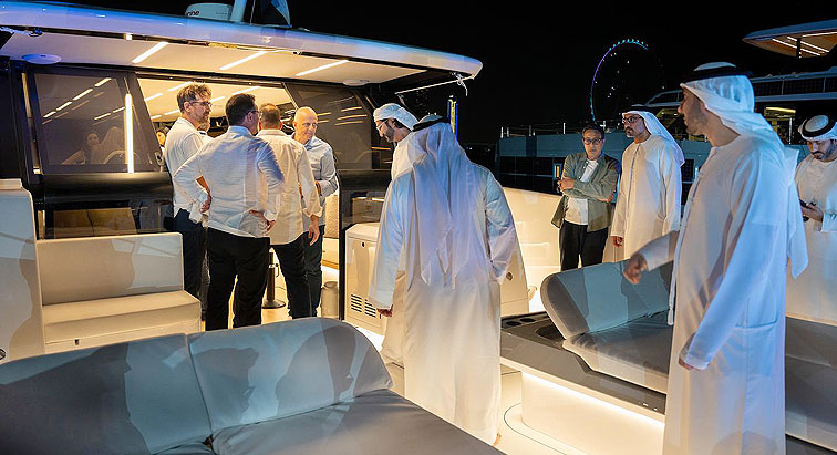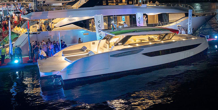 La presentación del 55 ULTIMA fue una gran fiesta nocturna en la que un gran número de visitantes, autoridades y periodistas de todo el mundo pudieron ver en directo la llegada del nuevo modelo al pantalán del Dubai International Boat Show 2025.