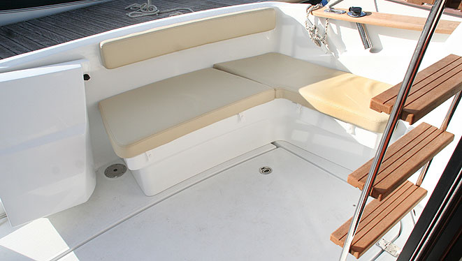 La puerta de entrada situada en estribor nos deja apreciar el gran grosor del espejo del perfil de popa, para acceder a una bañera bastante amplia en la que cuenta con un asiento modular en forma de L, con estiba en su interior, que podría ser desmontado totalmente. También incorpora en el suelo un gran portón de acceso a la sentina, con bastante espacio y un armario lateral para la bombona de butano de la cocina, así como una escalera de estructura tubular en inox-teca, ancha pero con muy poco ángulo.