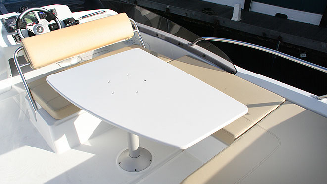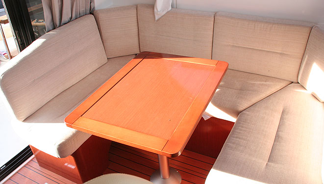 El flyingbridge, que caracteriza a este modelo, es de un tamaño superior a lo esperado para esta eslora, más largo que estrecho y que incorpora en la popa un arco moldeado muy bajo que cuelga ligeramente sobre la bañera. En su distribución adopta una dinette en la parte posterior, con asiento en forma de U y mesa amplia, que se puede abatir para crear un solarium a resguardo de las miradas. Además incluye un asiento doble para el piloto, formado por el respaldo reversible del comedor exterior y que se enfrenta a una consola de gobierno baja, que ocupa de banda a banda y que ofrece en su sencillo diseño bastante espacio para electrónica.