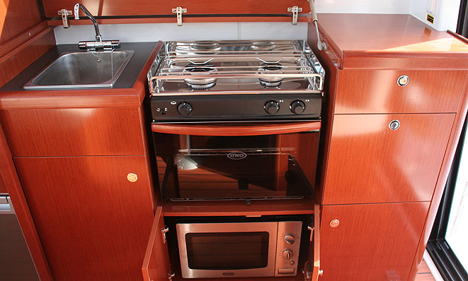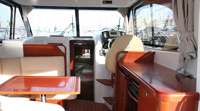 En la distribución no se han buscado sorpresas, aplicando un modelo habitual en Antares, con una cocina lineal junto a la entrada, con tapa cubriendo fregadero y fogones, además de varios armarios y un horno instalado muy bajo. En la banda contraria se ubica el comedor, con un cómodo sofá en forma de U y una mesa de buen tamaño. Directamente tras el parabrisas delantero ofrece un asiento doble y alto en babor para los acompañantes y un asiento individual en la banda contraria, sobre la estructura de la nevera, reservado al piloto. Éste disfruta de un reposapiés y una consola alta de curioso diseño que se podría aprovechar mejor.