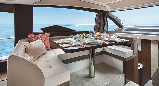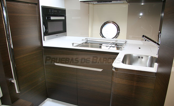En la unidad que estuvimos probando se había adoptado un completo mueble-bar con fogones y nevera que resulta un complemento ideal para convertir ese sobrepuente en el centro de la embarcación. Además, incluye de modo estándar una dinette con mesa de buen tamaño, un gran solarium delantero acompañado por un cofre de estiba y un puesto de gobierno exterior con una consola de altura media y completo equipamiento.