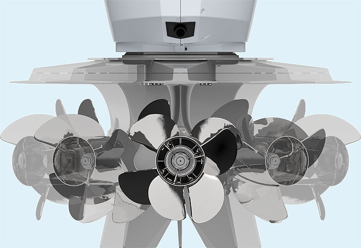 Para transmitir sin pérdida toda la potencia y proporcionar una mayor potencia de arrastre, Mercury ha desarrollado para el nuevo SeaPro 500 una transmisión de doble hélice contra-rotatoria de especial diseño que permiten a las nuevas hélices impulsar la embarcación para que entre en planeo de forma rápida y eficiente, al tiempo que ofrecen un control excepcional y un gran ahorro de combustible a velocidades bajas.