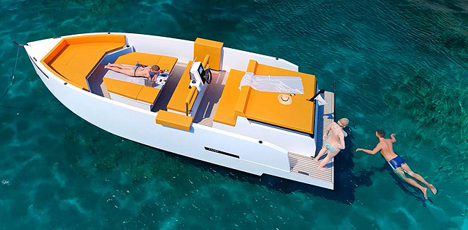 Esta versión de cubierta Deck está especialmente adaptada como Tender de lujo, para lo que mantiene una altura de cubierta limitada al máximo para facilitar su estiba en el garaje de un megayate.