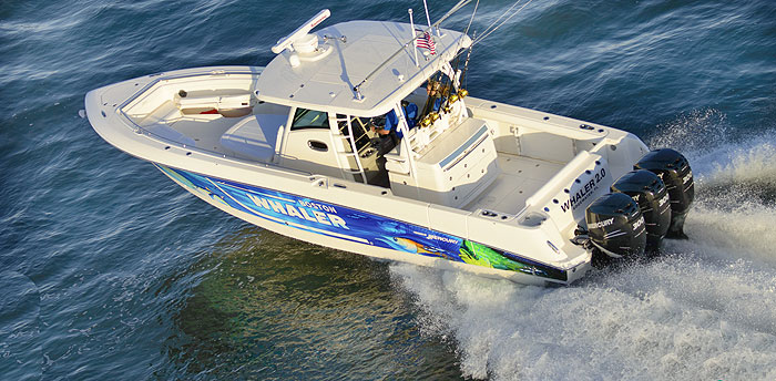 Los modelos de mayor eslora de Boston Whaler, como esta 350 Outrage, siempre aseguran unas grandes experiencias de navegación, ya sea por su capacidad para afrontar el mar o por su práctico diseño.